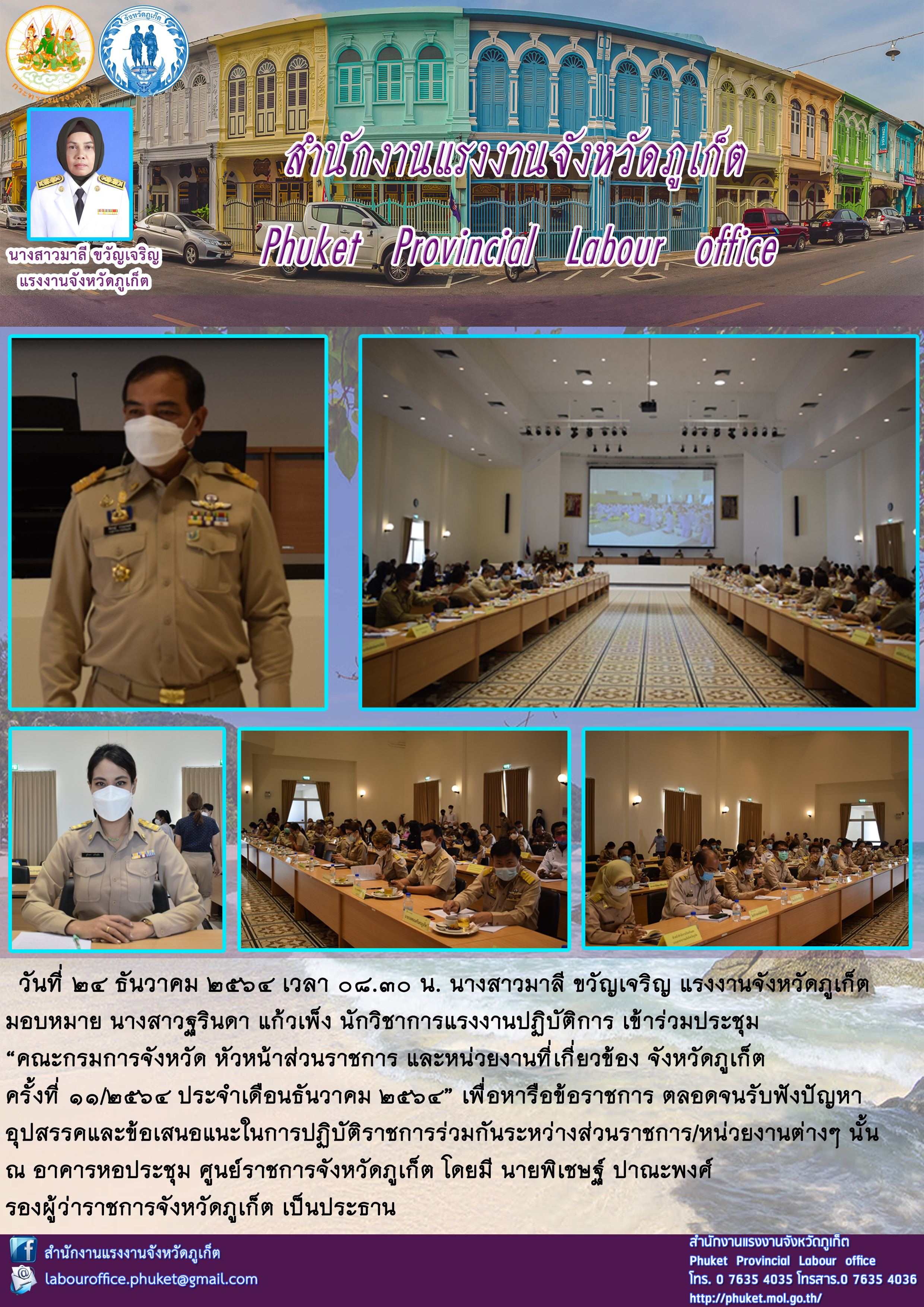 นางสาวมาลี ขวัญเจริญ แรงงานจังหวัดภูเก็ต มอบหมาย นางสาวฐรินดา แก้วเพ็ง นักวิชาการแรงงานปฏิบัติการ เข้าร่วมประชุม “คณะกรมการจังหวัด หัวหน้าส่วนราชการ และหน่วยงานที่เกี่ยวข้อง จังหวัดภูเก็ต ครั้งที่ 11/2564 ประจำเดือนธันวาคม 2564”