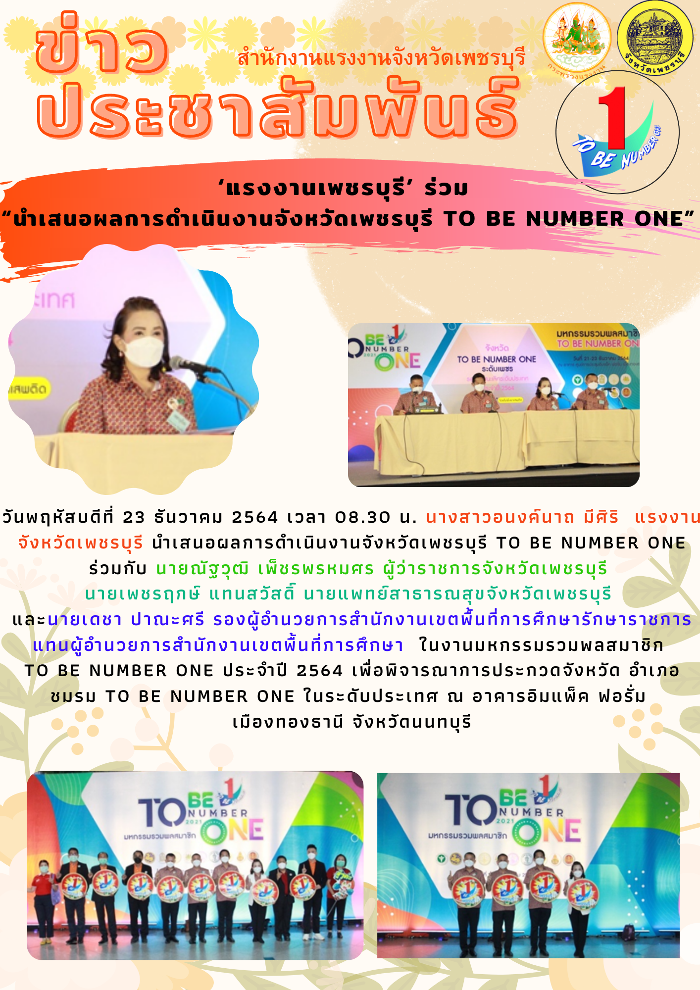 สำนักงานแรงงานจังหวัดเพชรบูรณ์ ร่วมนำเสนอผลการดำเนินงานโครงการ TO BE NUMBER ONE ของจังหวัดเพชรบูรณ์