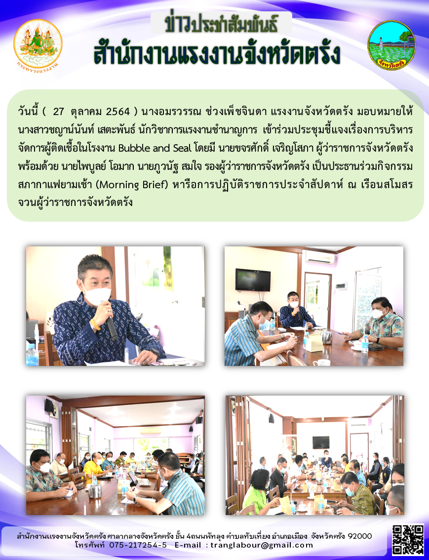 แรงงานจังหวัดตรัง ร่วมประชุมเพื่อชี้แจงเรื่องการบริหารจัดการผู้ติดเชื้อในโรงงาน Bubble and Seal ณ เรือนสโมสร จวนผู้ว่าราชการจังหวัดตรัง