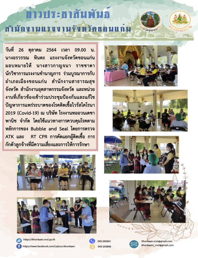 เจ้าหน้าที่สำนักงานแรงงานจังหวัดขอนแก่น ร่วมบูรณาการกับอำเภอเมืองขอนแก่น สำนักงานสาธารณสุขจังหวัด สำนักงานอุตสาหกรรมจังหวัด และหน่วยงานที่เกี่ยวข้องเข้าร่วมประชุมป้องกันและแก้ไขปัญหาการแพร่ระบาดของโรคติดเชื้อไวรัสโคโรนา 2019 (Covid-19) ณ บริษัท โรงงานทออวนเดชาพานิช จำกัด