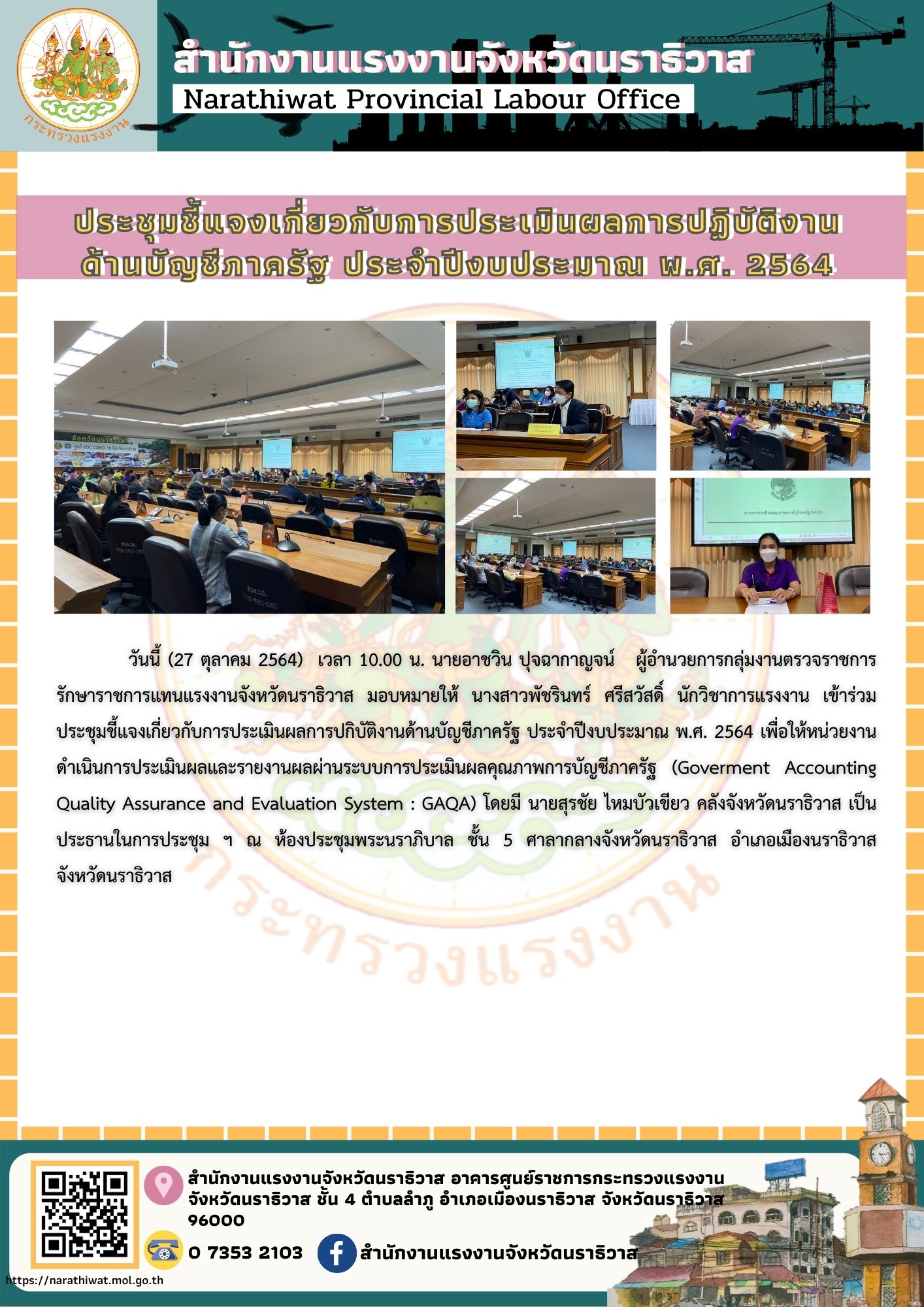 สำนักงานแรงงานจังหวัดนราธิวาส เข้าร่วมประชุมชี้แจงเกี่ยวกับการประเมินผลการปกิบัติงานด้านบัญชีภาครัฐ ประจำปีงบประมาณ พ.ศ. 2564