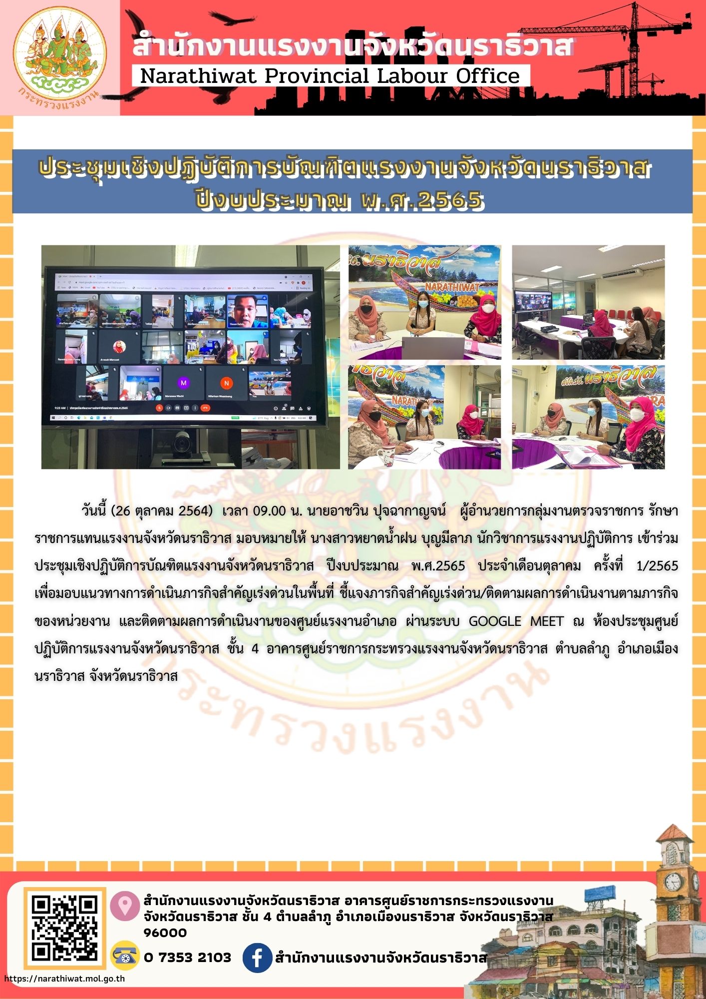 สำนักงานแรงงานจังหวัดนราธิวาส ร่วมประชุมเชิงปฏิบัติการบัณฑิตแรงงานจังหวัดนราธิวาส ปีงบประมาณ พ.ศ.2565