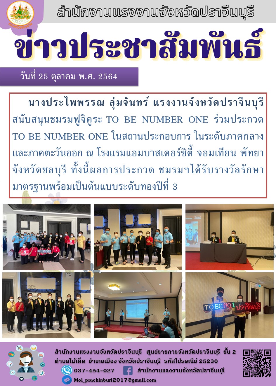 สำนักงานแรงงานจังหวัดปราจีนบุรี สนับสนุนชมรมฟูจิคูระ TO BE NUMBER ONE ร่วมประกวด TO BE NUMBER ONE ในสถานประกอบการ ในระดับภาค