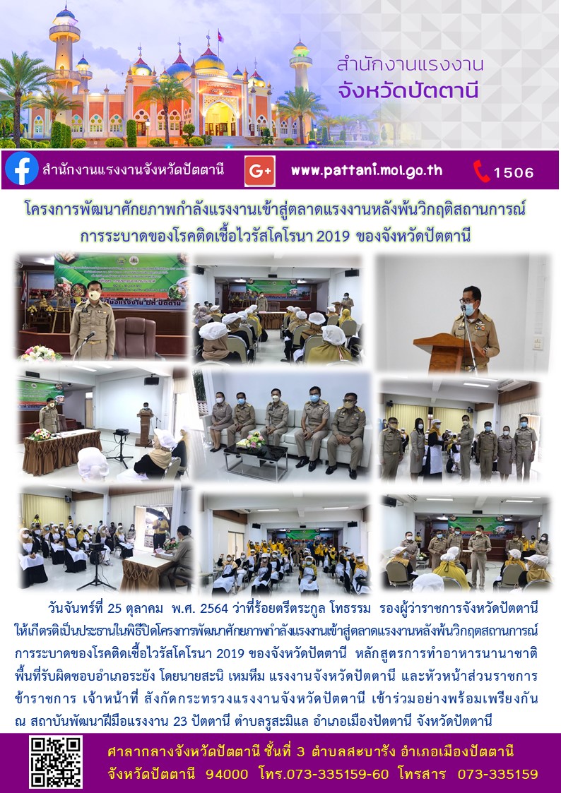 สรจ.ปัตตานี ปิดโครงการพัฒนาศักยภาพกำลังแรงงานเข้าสู่ตลาดแรงงานหลังพ้นวิกฤติสถานการณ์การระบาดของโรคติดเชื้อไวรัสโคโรนา 2019 ของจังหวัดปัตตานี