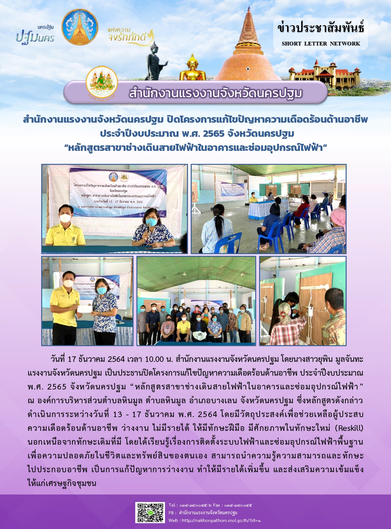 สำนักงานแรงงานจังหวัดนครปฐม ปิดโครงการแก้ไขปัญหาความเดือดร้อนด้านอาชีพ ประจำปีงบประมาณ พ.ศ. 2565 จังหวัดนครปฐม “หลักสูตรสาขาช่างเดินสายไฟฟ้าในอาคารและซ่อมอุปกรณ์ไฟฟ้า”