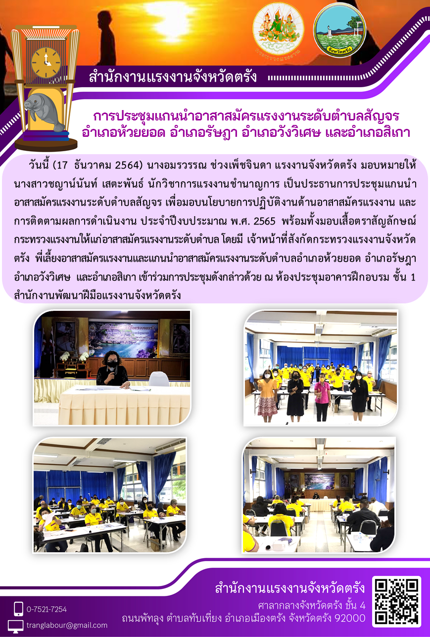 แรงงานจังหวัดตรัง มอบหมายให้ นางสาวชญาน์นันท์ เสตะพันธ์ นักวิชาการแรงงานชำนาญการ เป็นประธานการประชุมแกนนำอาสาสมัครแรงงานระดับตำบลสัญจร