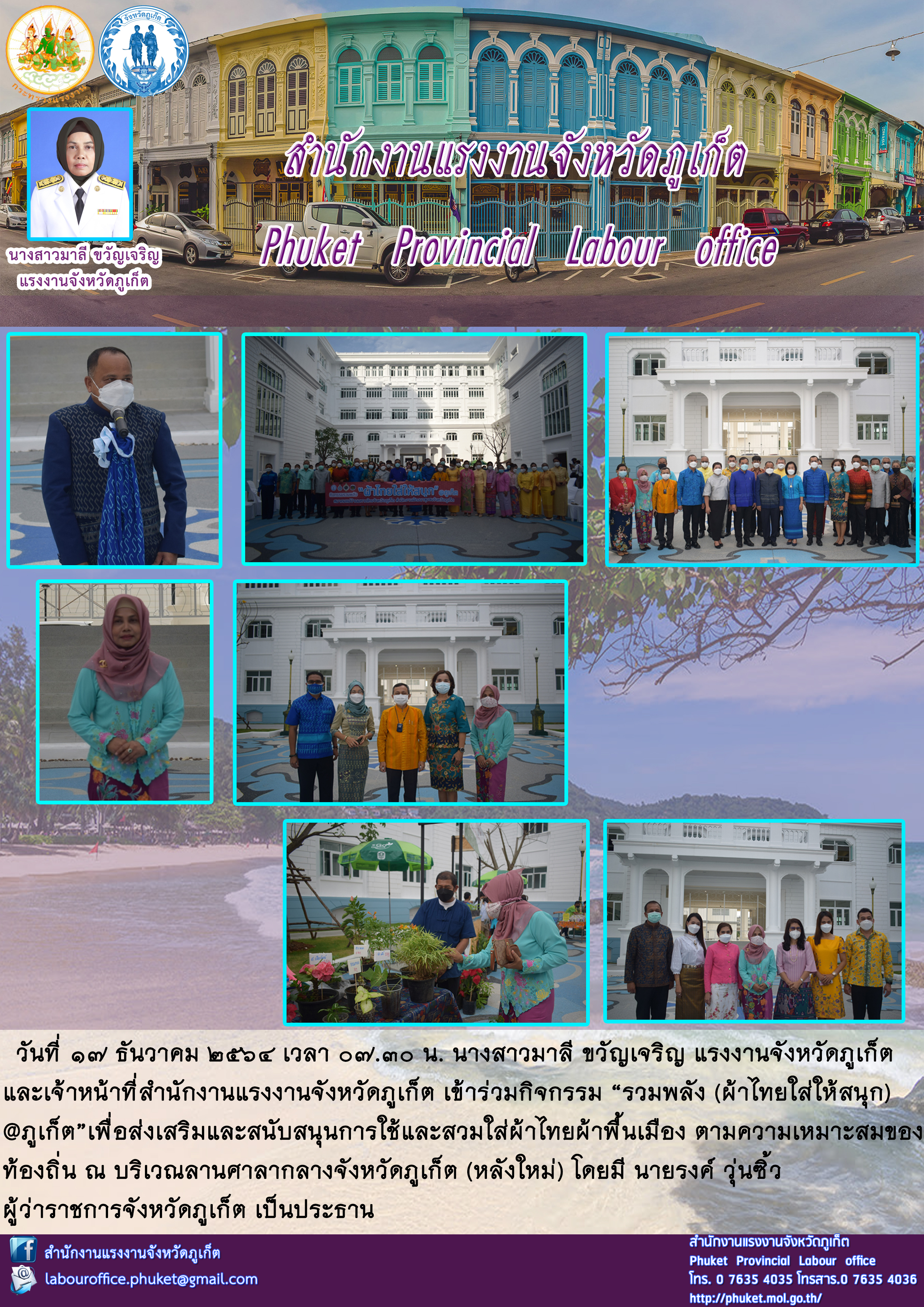 นางสาวมาลี ขวัญเจริญ แรงงานจังหวัดภูเก็ต และเจ้าหน้าที่สำนักงานแรงงานจังหวัดภูเก็ต เข้าร่วมกิจกรรม “รวมพลัง (ผ้าไทยใส่ให้สนุก) @ภูเก็ต”