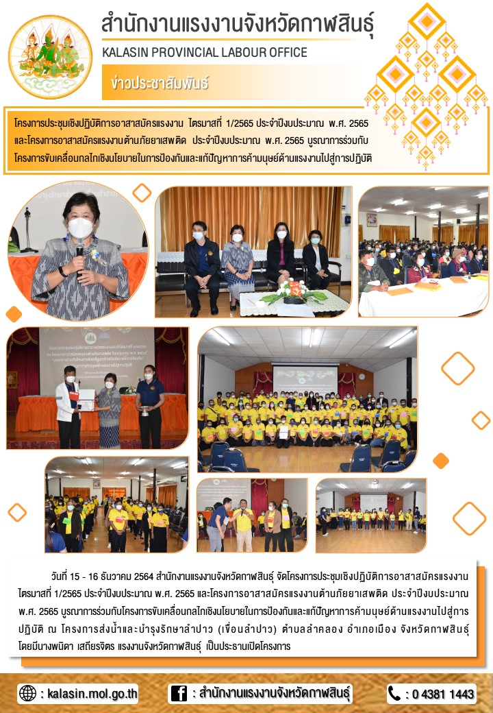 สำนักงานแรงงานจังหวัดกาฬสินธุ์ จัดประชุมเชิงปฏิบัติการอาสาสมัครแรงงาน ไตรมาส 1/2565 ประจำปีงบประมาณ พ.ศ. 2565