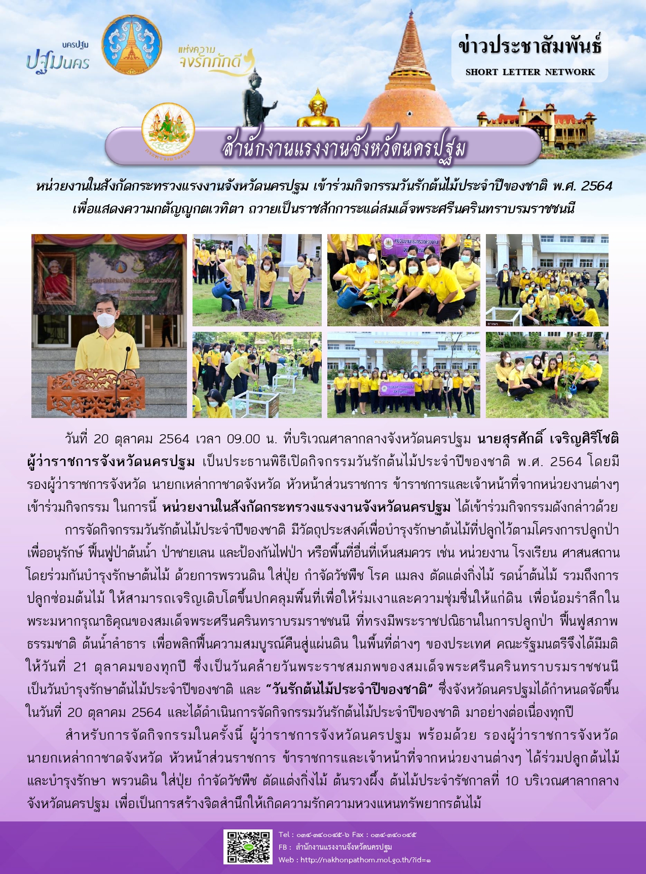 หน่วยงานในสังกัดกระทรวงแรงงานจังหวัดนครปฐม เข้าร่วมกิจกรรมวันรักต้นไม้ประจำปีของชาติ พ.ศ. 2564 เพื่อแสดงความกตัญญูกตเวทิตา ถวายเป็นราชสักการะแด่สมเด็จพระศรีนครินทราบรมราชชนนี