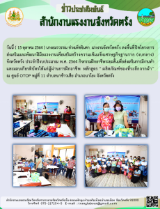 แรงงานจังหวัดตรัง ลงพื้นที่ปิดโครงการส่งเสริมและพัฒนาฝีมือแรงงานเพื่อเสริมสร้างความเข้มแข็งเศรษฐกิจฐานราก (งบกลาง) จังหวัดตรัง ประจำปีงบประมาณ พ.ศ. 2564 กิจกรรมฝึกอาชีพระยะสั้นเพื่อส่งเสริมการมีงานทำและมอบเกียรติบัตรให้แก่ผู้ผ่านการฝึกอาชีพ หลักสูตร “ ผลิตภัณฑ์ของที่ระลึกจากผ้า”