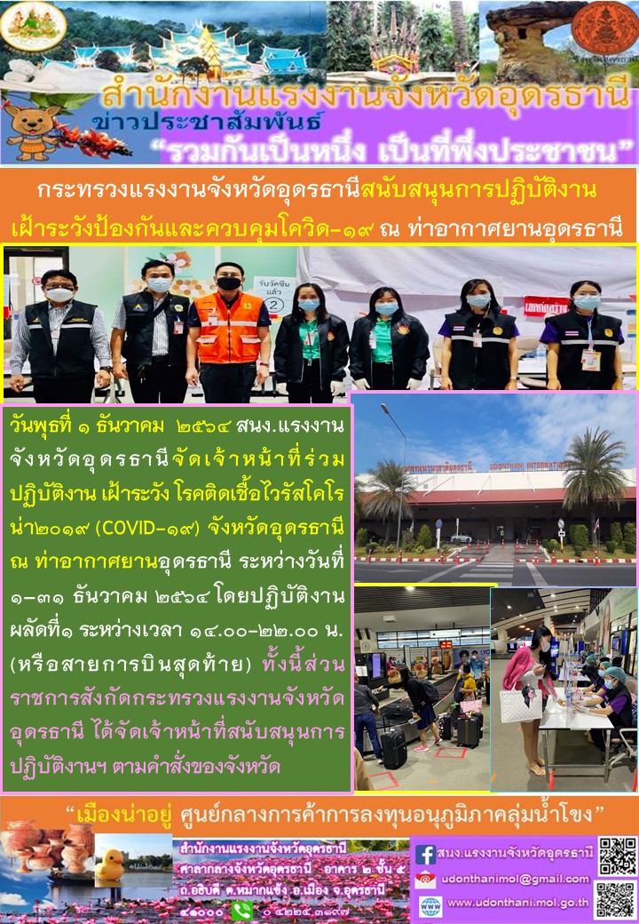 กระทรวงแรงงานจังหวัดอุดรธานีสนับสนุนการปฏิบัติงานเฝ้าระวังและควบคุมโรคโควิด-19 ณ ท่าอากาศยานอุดรธานี