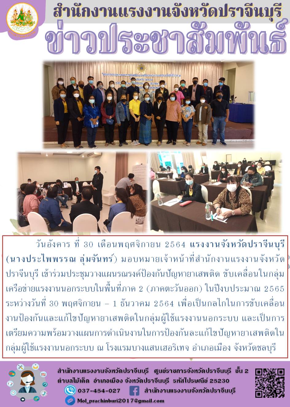 นางประไพพรรณ ลุ่มจันทร์ แรงงานจังหวัดปราจีนบุรี มอบหมายเจ้าหน้าที่สำนักงานแรงงานจังหวัดปราจีนบุรี เข้าร่วมประชุมวางแผนรณรงค์ป้องกันปัญหายาเสพติด ขับเคลื่อนในกลุ่มเครือข่ายแรงงานนอกระบบในพื้นที่ภาค 2 (ภาคตะวันออก) ในปีงบประมาณ 2565