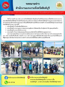 แรงงานจังหวัดสิงห์บุรีพร้อมด้วยหน่วยงานในสังกัดกระทรวงแรงงาน ร่วมบูรณาการตรวจสอบการทำงานของแรงงานต่างด้าวและสถานประกอบการในเขตพื้นที่ และที่พักคนงานก่อสร้าง