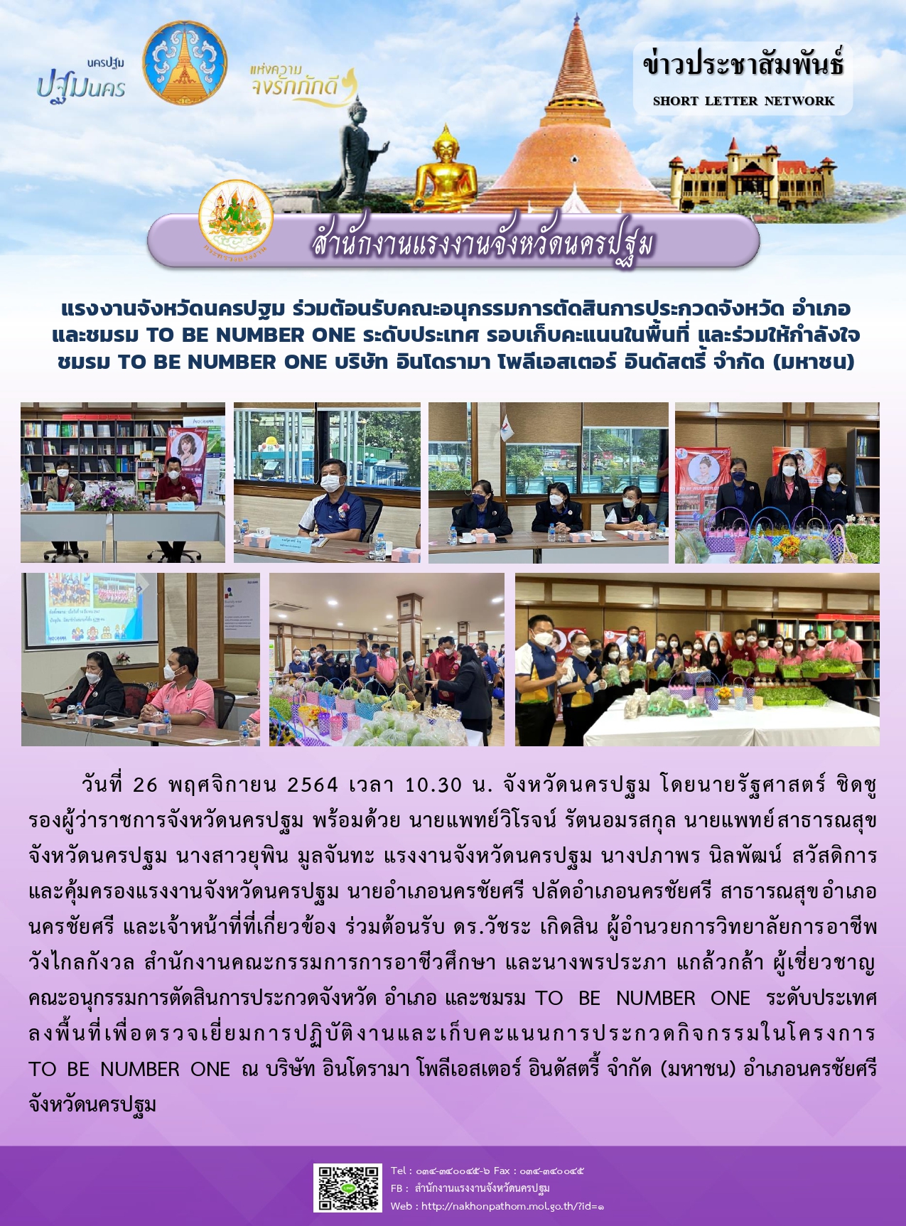 แรงงานจังหวัดนครปฐม ร่วมต้อนรับคณะอนุกรรมการตัดสินการประกวดจังหวัด อำเภอ และชมรม TO BE NUMBER ONE ระดับประเทศ รอบเก็บคะแนนในพื้นที่ และร่วมให้กำลังใจชมรม TO BE NUMBER ONE บริษัท อินโดรามา โพลีเอสเตอร์ อินดัสตรี้ จำกัด (มหาชน)