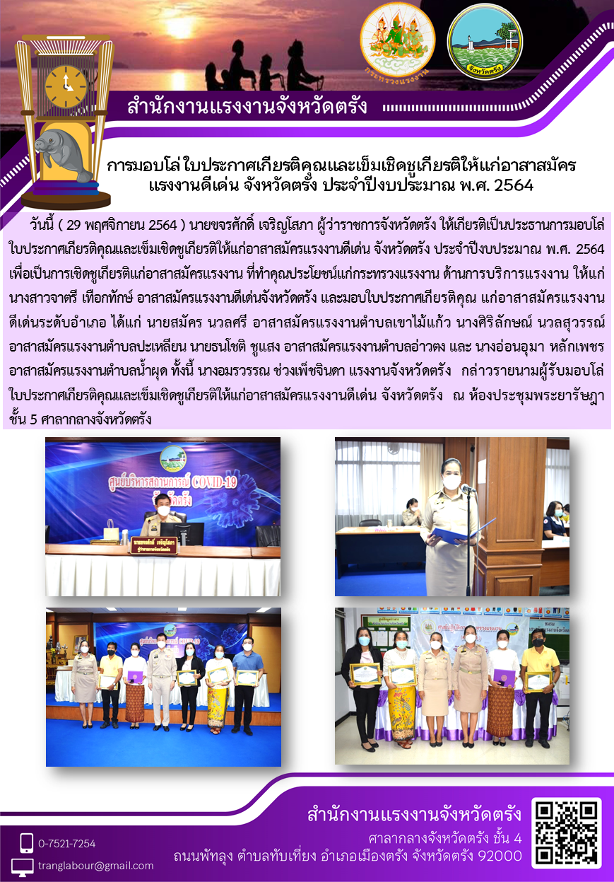 แรงงานจังหวัดตรัง กล่าวรายนามผู้รับมอบโล่ ใบประกาศเกียรติคุณและเข็มเชิดชูเกียรติให้แก่อาสาสมัครแรงงานดีเด่น จังหวัดตรัง ประจำปีงบประมาณ พ.ศ. 2564