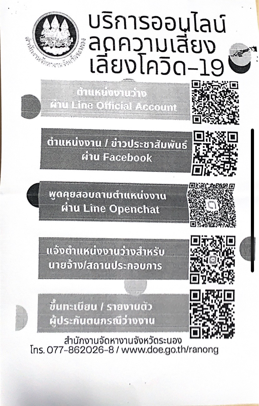 ประชาสัมพันธ์ตำแหน่งว่างงานเพื่อส่งเสริมการมีงานทำ การจัดหางาน การให้บริการไปทำงานต่างประเทส การทำงานของคนต่างด้าว การแนะแนวอาชีพ และคุ้มครองคนทำงาน จัดทำโดย สำนักงานจัดหางานจังหวัดระนอง
