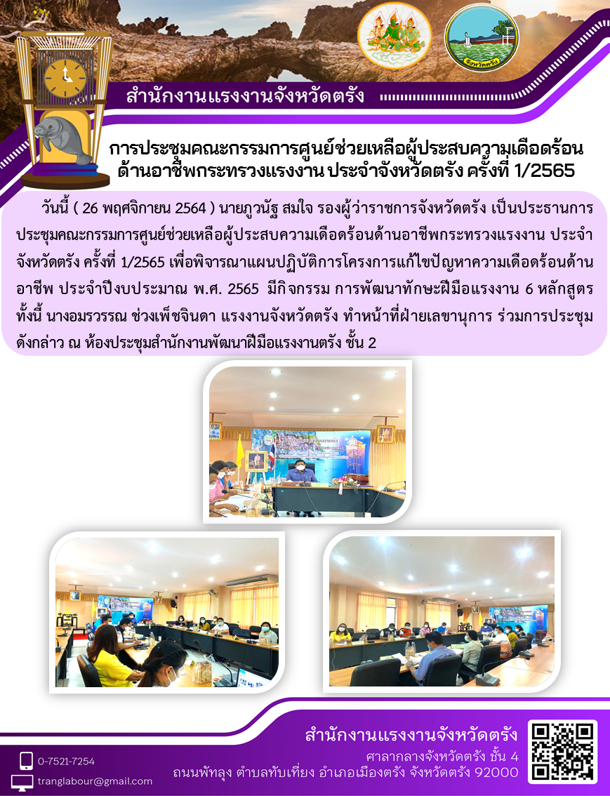 แรงงานจังหวัดตรัง จัดประชุมคณะกรรมการศูนย์ช่วยเหลือผู้ประสบความเดือดร้อนด้านอาชีพกระทรวงแรงงาน ประจำจังหวัดตรัง ครั้งที่ 1/2565