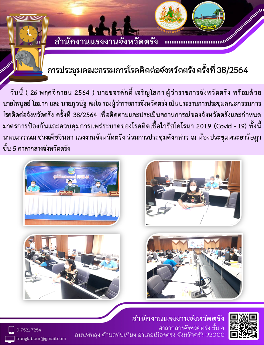 แรงงานจังหวัดตรัง ร่วมการประชุมคณะกรรมการโรคติดต่อจังหวัดตรัง ครั้งที่ 38/2564
