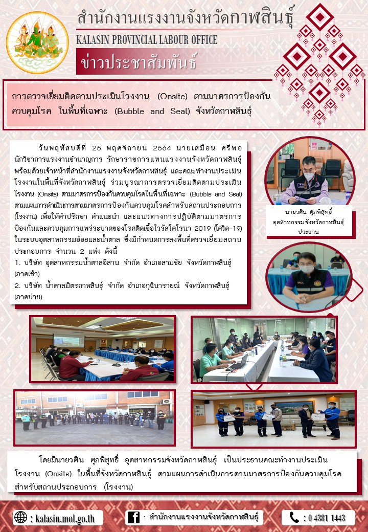 แรงงานจังหวัดกาฬสินธุ์ ร่วมคณะการตรวจเยี่ยมติดตามประเมินโรงงาน (Onsite) ตามมาตรการป้องกันควบคุมโรคในพื้นที่เฉพาะ (Bubble and Seal) จังหวัดกาฬสินธุ์