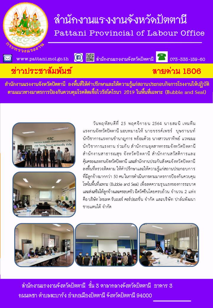 สำนักงานแรงงานจังหวัดปัตตานี ลงพื้นที่ให้คำปรึกษาและให้ความรู้แก่สถานประกอบกิจการโรงงานให้ปฏิบัติตามแนวทางมาตรการป้องกันควบคุมโรคติดเชื้อไวรัสโคโรนา 2019 ในพื้นที่เฉพาะ (Bubble and Seal)