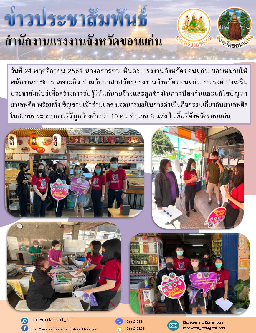 สำนักงานแรงงานจังหวัดขอนแก่น ร่วมกับอสร.จังหวัดขอนแก่นรณรงค์ ประชาสัมพันธ์การป้องกันและแก้ไขปัญหายาเสพติดให้กับนายจ้างและลูกจ้าง ในสถานประกอบการที่มีลูกจ้างต่ำกว่า 10 คน