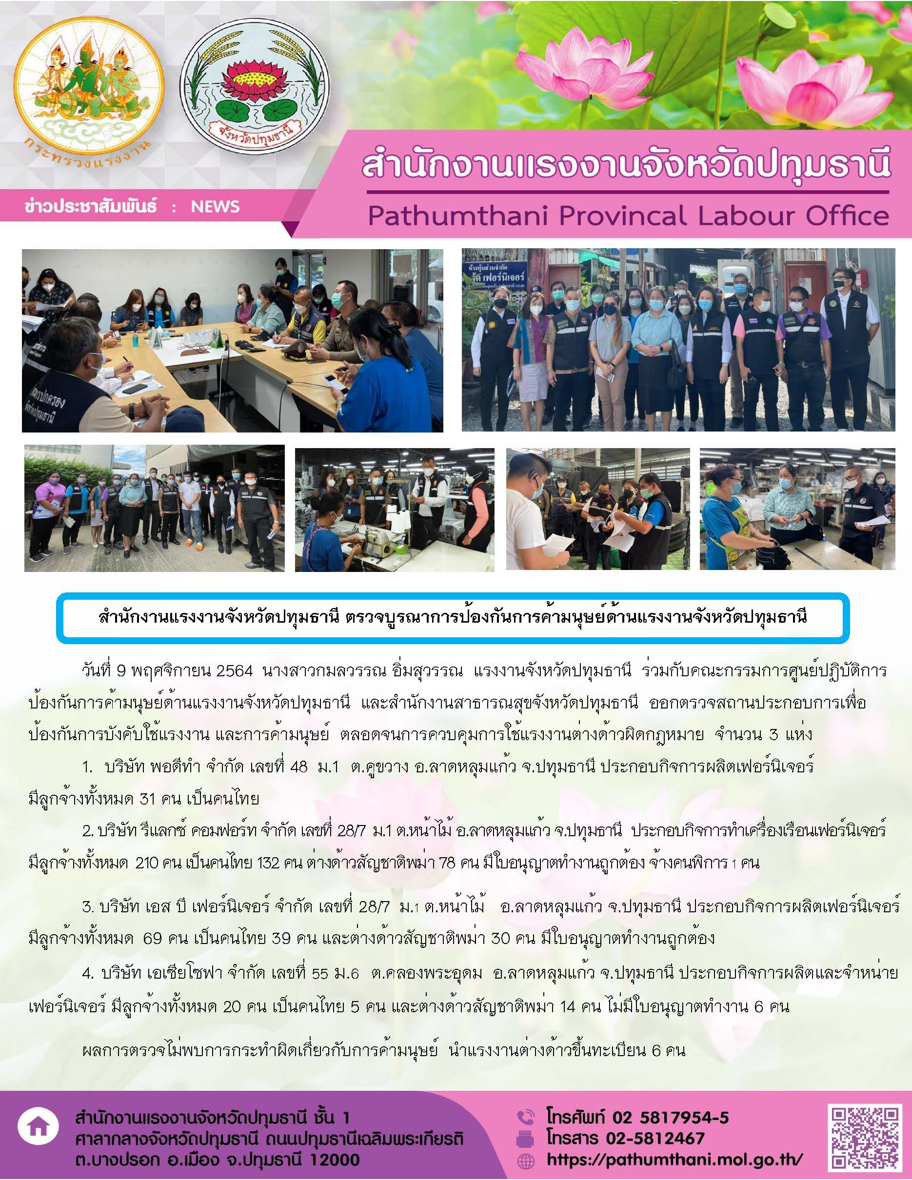 สำนักงานแรงงานจังหวัดปทุมธานี ตรวจบูรณาการป้องกันการค้ามนุษย์ด้านแรงงานจังหวัดปทุมธานี