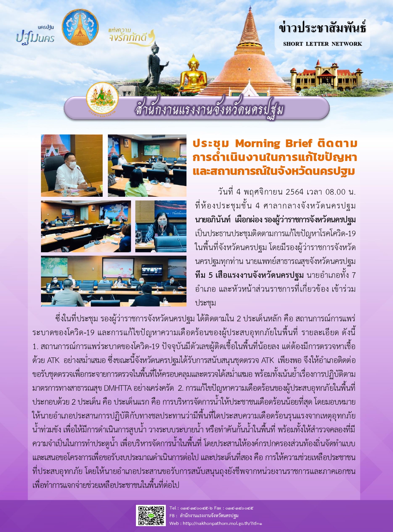 หัวหน้าส่วนราชการสังกัดกระทรวงแรงงานจังหวัดนครปฐม ประชุม Morning Brief ติดตามการดำเนินงานในการแก้ไขปัญหาและสถานการณ์ในจังหวัดนครปฐม