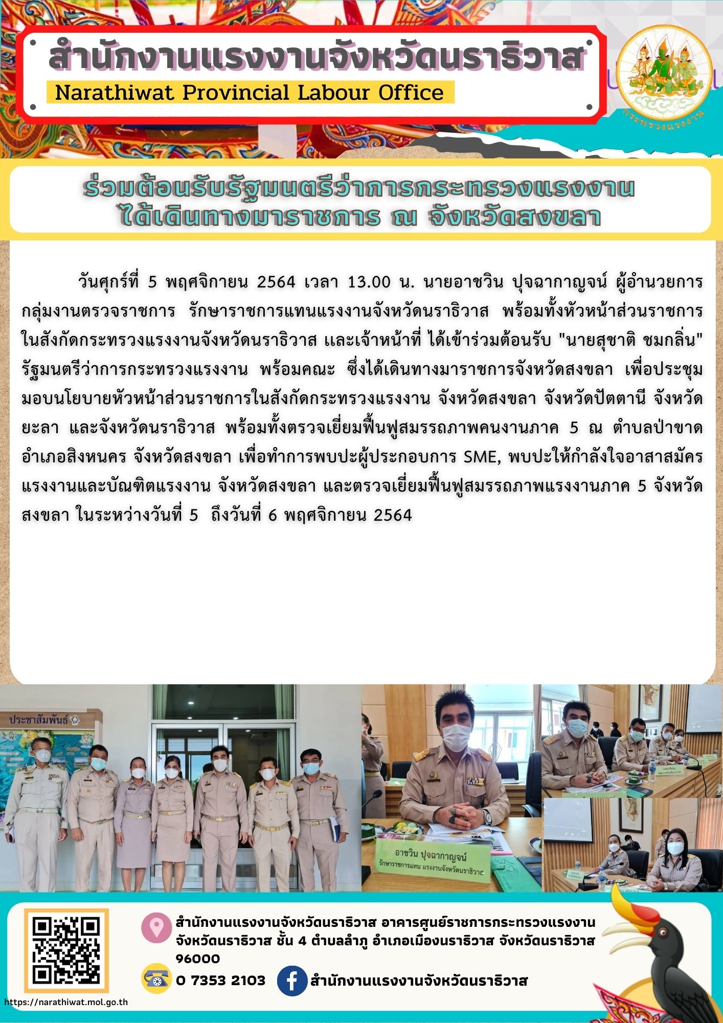 แรงงานจังหวัดนราธิวาส ร่วมต้อนรับรัฐมนตรีว่าการกระทรวงแรงงาน ได้เดินทางมาราชการ ณ จังหวัดสงขลา