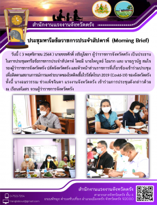 แรงงานจังหวัดตรัง ร่วมการประชุมหารือข้อราชการประจำสัปดาห์ เพื่อติดตามสถานการณ์การแพร่ระบาดของโรคติดเชื้อไวรัสโคโรนา 2019 (Covid-19) ของจังหวัดตรัง