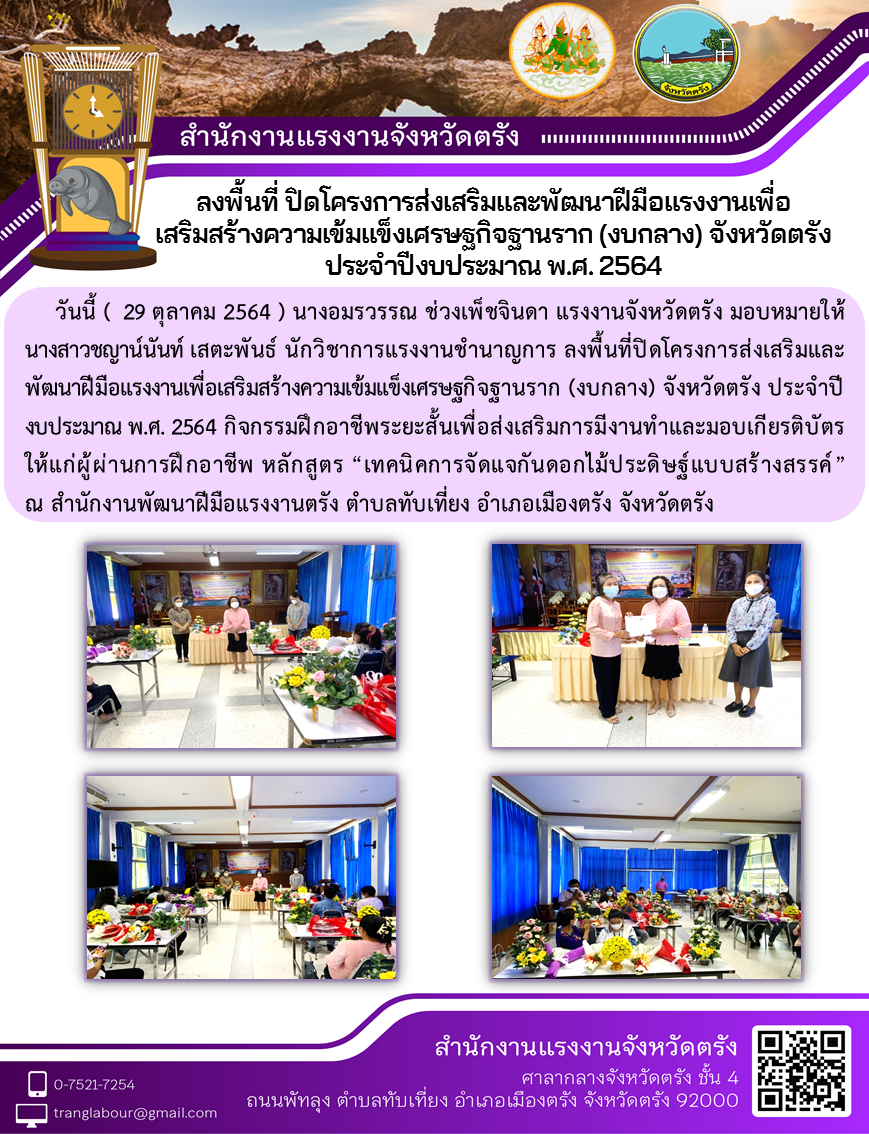 แรงงานจังหวัดตรัง ลงพื้นที่ปิดโครงการส่งเสริมและพัฒนาฝีมือแรงงานเพื่อเสริมสร้างความเข้มแข็งเศรษฐกิจฐานราก (งบกลาง) จังหวัดตรัง ประจำปีงบประมาณ พ.ศ. 2564 หลักสูตร “เทคนิคการจัดแจกันดอกไม้ประดิษฐ์แบบสร้างสรรค์” ณ สำนักงานพัฒนาฝีมือแรงงานตรัง