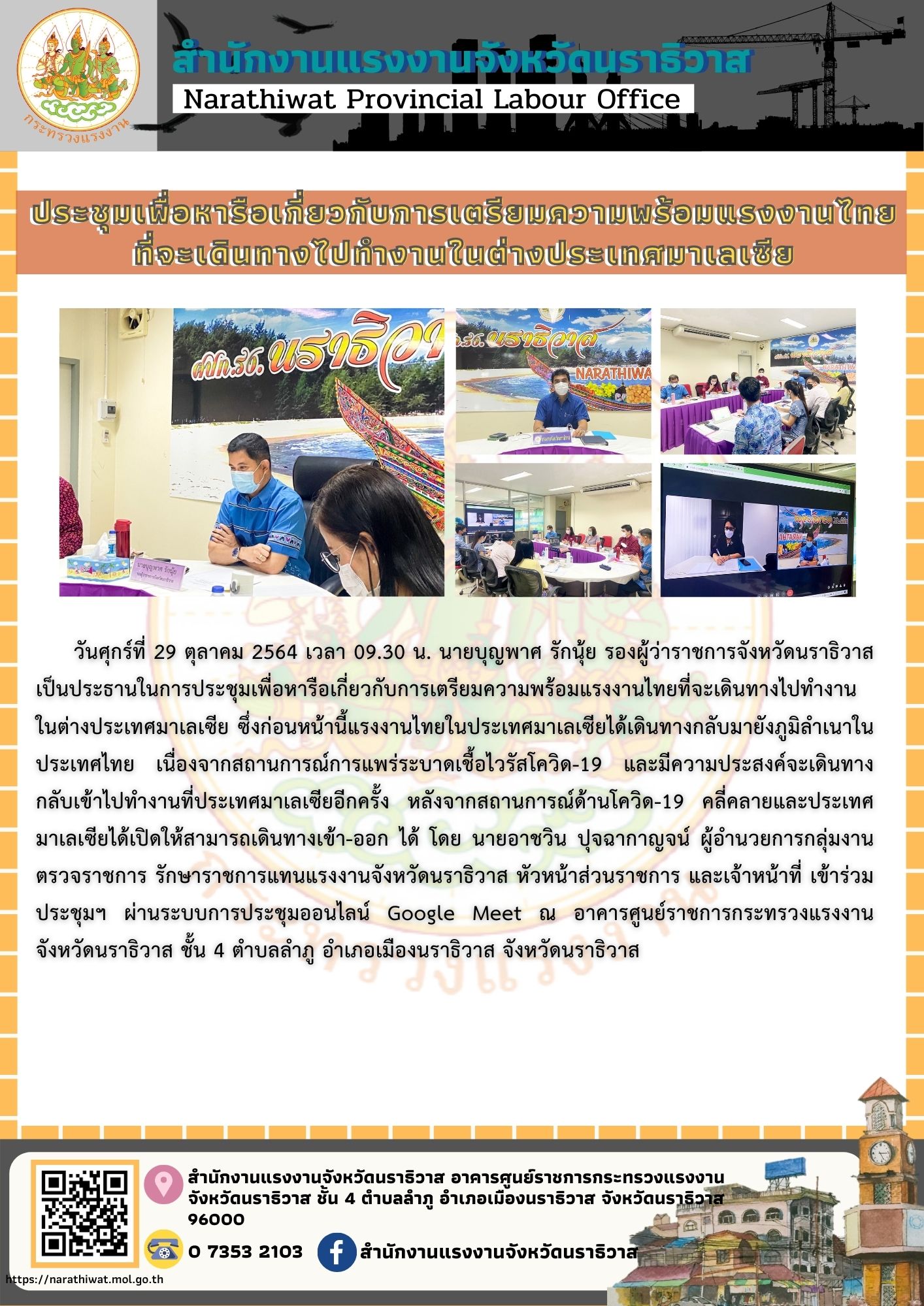 แรงงานจังหวัดนราธิวาส เข้าร่วมประชุมเพื่อหารือเกี่ยวกับการเตรียมความพร้อมแรงงานไทยที่จะเดินทางไปทำงานในต่างประเทศมาเลเซีย