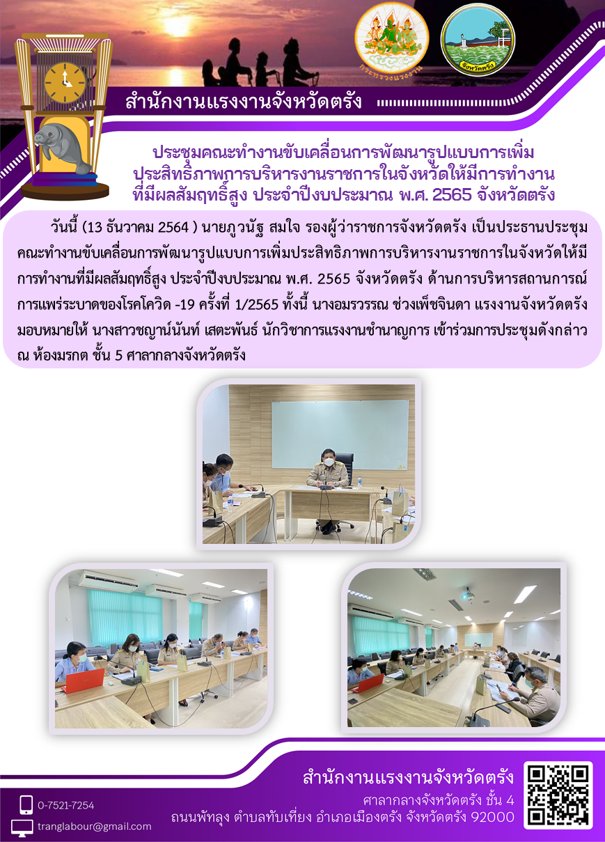 แรงงานจังหวัดตรัง ร่วมประชุมคณะทำงานขับเคลื่อนการพัฒนารูปแบบการเพิ่มประสิทธิภาพการบริหารงานราชการในจังหวัดให้มีการทำงานที่มีผลสัมฤทธิ์สูง ประจำปีงบประมาณ พ.ศ. 2565 จังหวัดตรัง