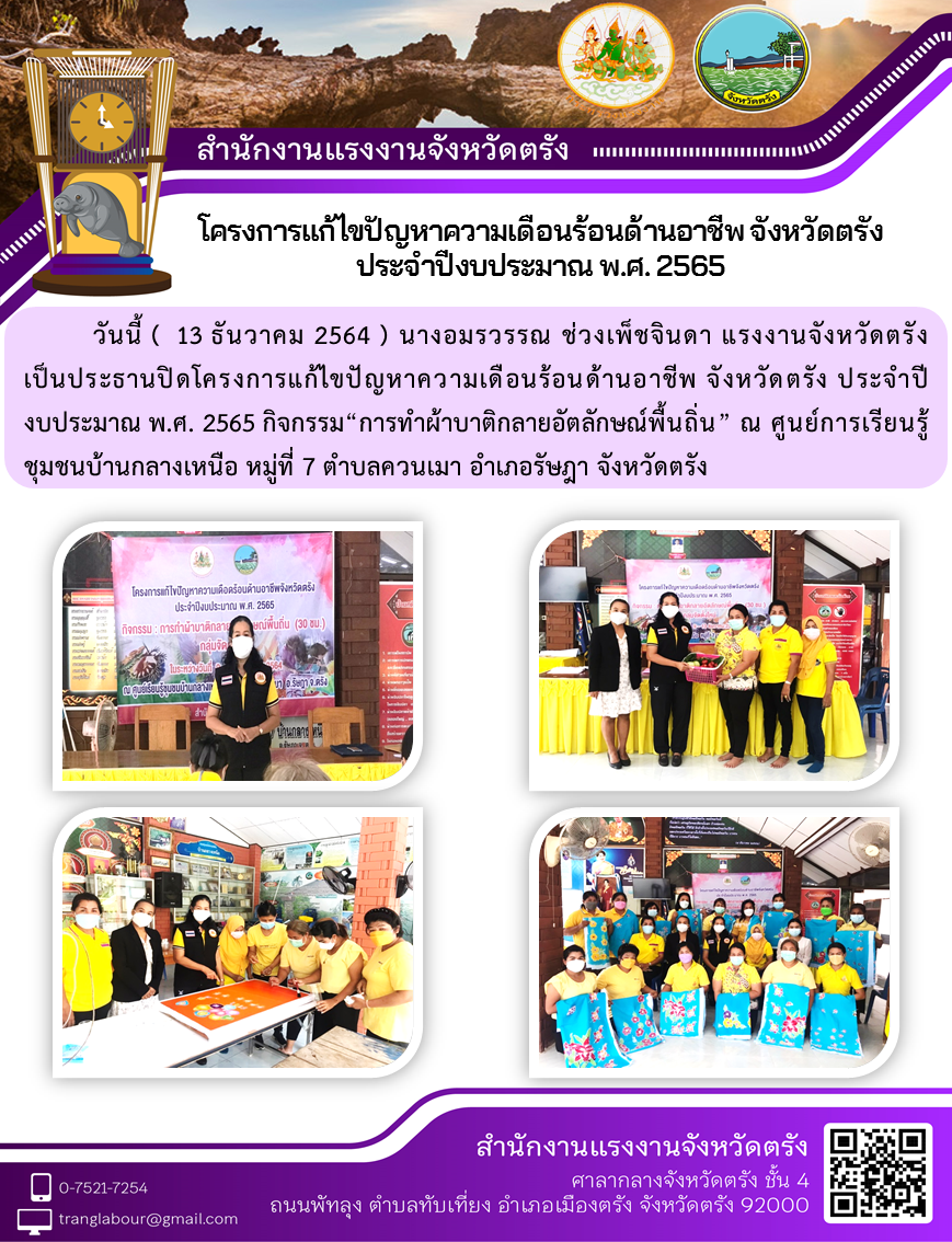 แรงงานจังหวัดตรัง ประธานปิดโครงการแก้ไขปัญหาความเดือนร้อนด้านอาชีพ จังหวัดตรัง ประจำปีงบประมาณ พ.ศ. 2565