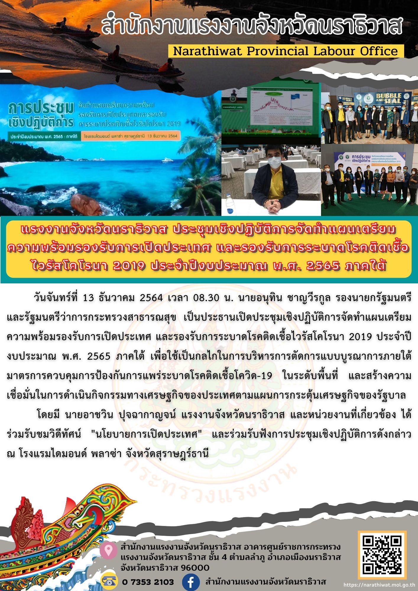 แรงงานจังหวัดนราธิวาส ประชุมเชิงปฏิบัติการจัดทำแผนเตรียมความพร้อมรองรับการเปิดประเทศ และรองรับการระบาดโรคติดเชื้อไวรัสโคโรนา 2019 ประจำปีงบประมาณ พ.ศ. 2565 ภาคใต้