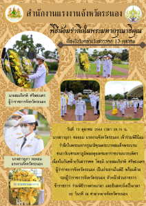 สำนักงานแรงงานจังหวัดระนองร่วมพิธีน้อมรำลึกในพระมหากรุณาธิคุณเนื่องในวันคล้ายวันสวรรคต 13 ตุลาคม