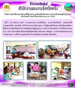 แรงงานจังหวัดตรังเปิดโครงการส่งเสริมและพัฒนาฝีมือแรงงานเพื่อเสริมสร้างความเข้มแข็งเศรษฐกิจฐานราก (งบกลาง) จังหวัดตรัง ประจำปีงบประมาณ พ.ศ. 2564 หลักสูตร “การทำขนมไทยและอาหารว่างจัดประชุม”