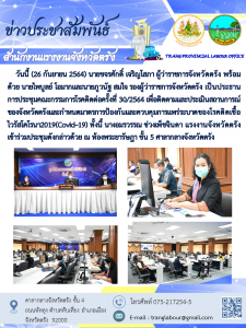 แรงงานจังหวัดตรัง ร่วมการประชุมคณะกรรมการโรคติดต่อครั้งที่ 30/2564 เพื่อติดตามและประเมินสถานการณ์ของจังหวัดตรังและกำหนดมาตรการป้องกันและควบคุมการแพร่ระบาดของโรคติดเชื้อไวรัสโคโรนา2019(Covid–19)