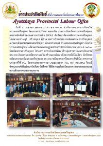 แรงงานจังหวัดพระนครศรีอยุธยา ร่วมลงนามบันทึกข้อตกลงความร่วมมือ (MOU) ดับมหาวิทยาลัยเทคนิคพระนครศรีอยุธยา โครงการยกระดับการพัฒนาด้านอุตสาหกรรมและพัฒนาศักยภาพแรงงาน