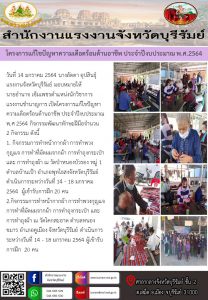 สรจ.สระบุรี ในนามศูนย์ประสานงานสถานการณ์การแพร่ระบาดของโรคติดเชื้อไวรัสโคโรนา 2019 กระทรวงแรงงาน ระดับจังหวัดสระบุรี เข้าตรวจสถานประกอบการกลุ่มเสี่ยงโดยเน้นที่มีลูกจ้างแรงงานต่างด้าว เพื่อประชาสัมพันธ์และทำความเข้าใจถึงมาตรการในการป้องกันการแพร่ระบาดของโรคติดต่อเชื้อไวรัสโคโรนา 2019 ตลอดจนการดูแลและห้ามเคลื่อนย้ายแรงงานต่างด้าว 3 สัญชาติ ทั้งเข้ามาหรือออกจากจังหวัดสระบุรี