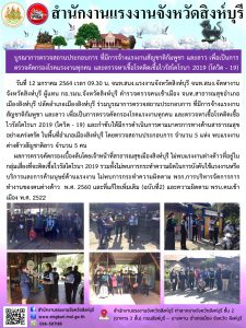 สำนักงานแรงงานจังหวัดสิงห์บุรีบูรณาการตรวจสถานประกอบการ ที่มีการจ้างแรงงานสัญชาติกัมพูชา และลาว เพื่อเป็นการตรวจคัดกรองโรคแรงงานทุกคน และตรวจหาเชื้อโรคติดเชื้อไวรัสโคโรนา 2019 (โควิด – 19)