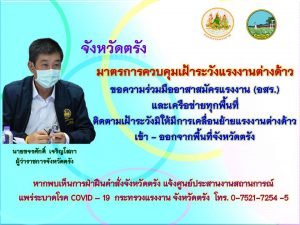 ผู้ว่าราชการจังหวัดตรังขอความร่วมมืออาสาสมัครแรงงาน (อสร.) และเครือข่ายทุกพื้นที่ ติดตามเฝ้าระวังมิให้มีการเคลื่อนย้ายแรงงานต่างด้าว เข้า – ออกจากพื้นที่จังหวัดตรัง