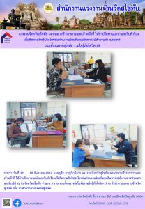 แรงงานจังหวัดสุโขทัย มอบหมายข้าราชการและเจ้าหน้าที่ ให้คำปรึกษาแนะนำและรับคำร้องเพื่อติดตามสิทธิประโยชน์แก่คนงานไทยที่เคยเดินทางไปทำงานต่างประเทศ รวมทั้งรณรงค์สุโขทัย รวมใจสู้ภัยโควิด-19