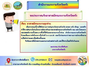 ประกาศแจ้งอาสาสมัครแรงงานจังหวัดตรังเลื่อนกำหนดการจัดกิจกรรมโครงการพัฒนาศักยภาพอาสาสมัครแรงงานจังหวัดตรัง