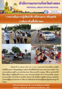 สำนักงานแรงงานจังหวัดอ่างทอง ตรวจเยี่ยมการปฏิบัติหน้าที่ตั้งด่านตรวจหรือจุดสกัดการเดินทางข้ามจังหวัดอ่างทอง