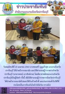 แรงงานจังหวัดปราจีนบุรี ได้นำหน้ากากอนามัย มอบให้ท่านรองผู้ว่าราชการจังหวัดปราจีนบุรี (นายวรพจน์ แววสิงห์งาม)