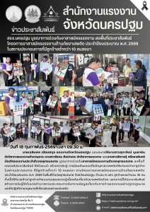 สรจ.นครปฐม บูรณาการร่วมกับอาสาสมัครแรงงาน ลงพื้นที่ประชาสัมพันธ์โครงการอาสาสมัครแรงงานต้านภัยยาเสพติด ประจำปีงบประมาณ พ.ศ. 2569 ในสถานประกอบการที่มีลูกจ้างต่ำกว่า 10 คนลงมา