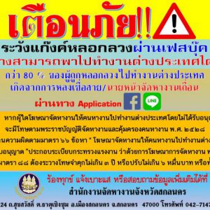 สำนักงานแรงงานจังหวัดสกลนคร แจ้งเตือนภัย !! ระวังแก๊งค์หลอกลวงผ่านเฟสบุ๊ค