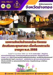 แรงงานจังหวัดอ่างทองร่วม กิจกรรม ส่งเสริมพระพุทธศาสนา เนื่องในเทศกาลวันมาฆบูชา พ.ศ. 2568