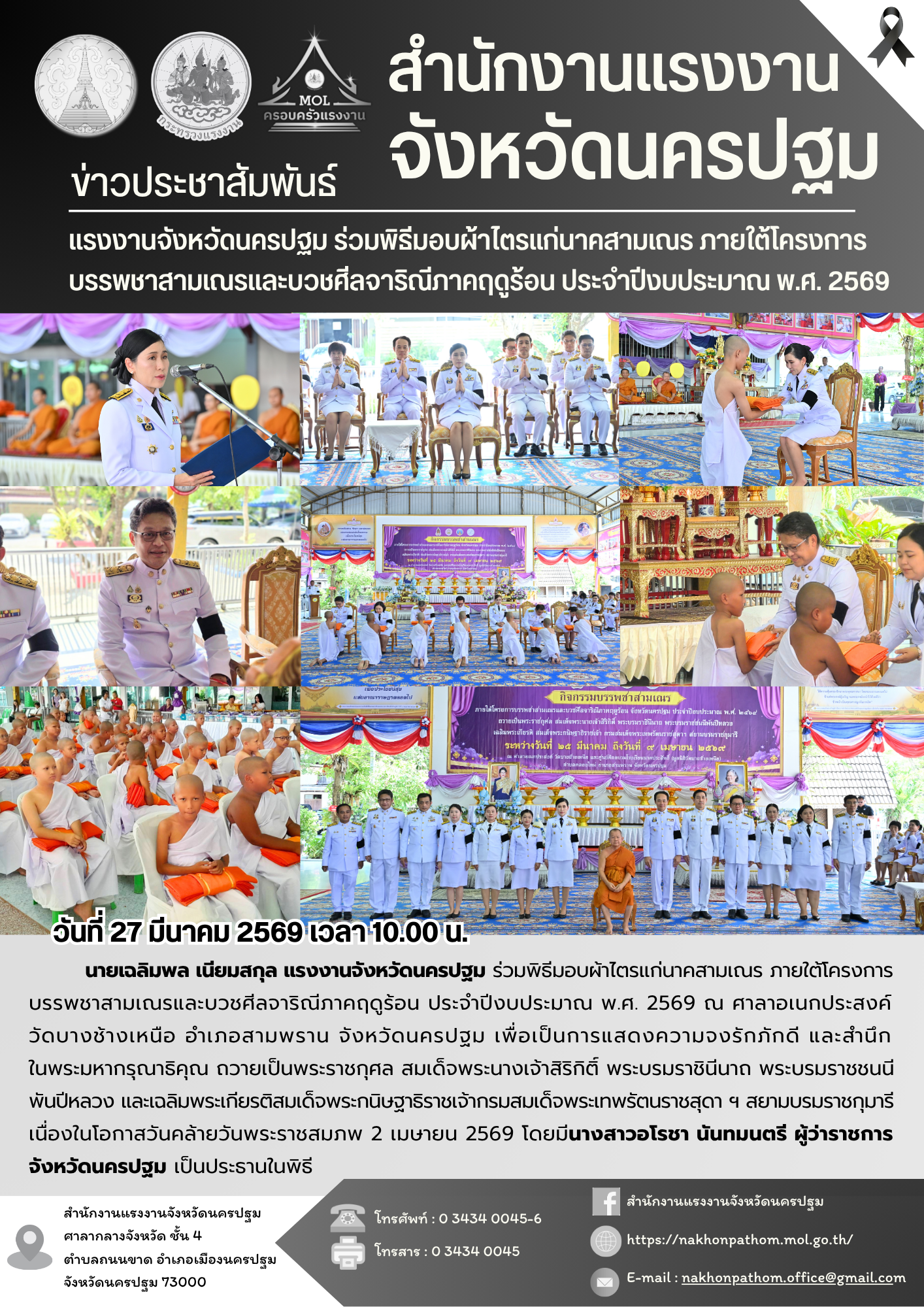 สรจ.นครปฐม ร่วมพิธีมอบผ้าไตรแก่นาคสามเณร ภายใต้โครงการบรรพชาสามเณรและบวชศีลจาริณีภาคฤดูร้อน ประจำปีงบประมาณ พ.ศ. 2569