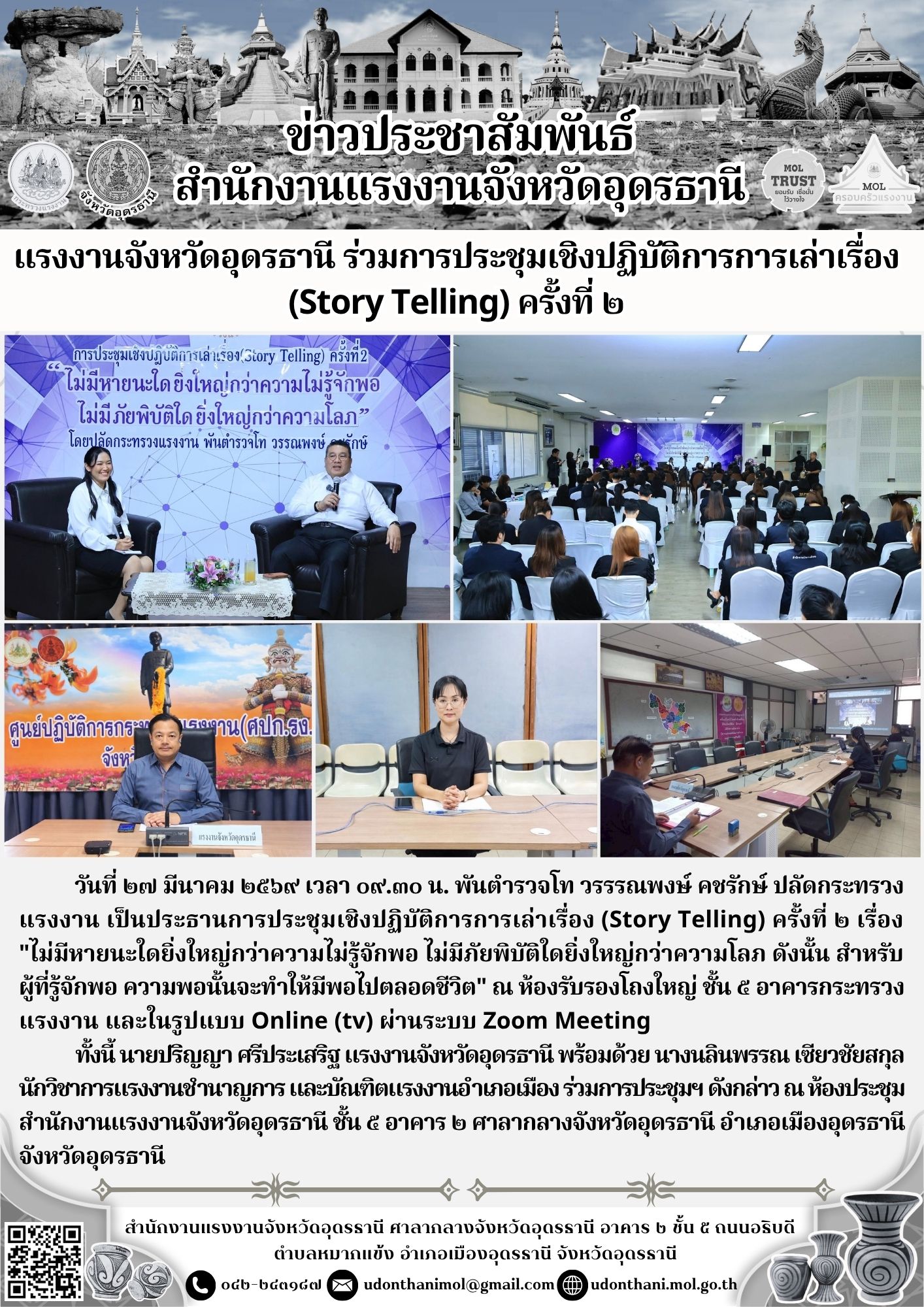 แรงงานจังหวัดอุดรธานี ร่วมการประชุมเชิงปฏิบัติการการเล่าเรื่อง (Story Telling) ครั้งที่ ๒